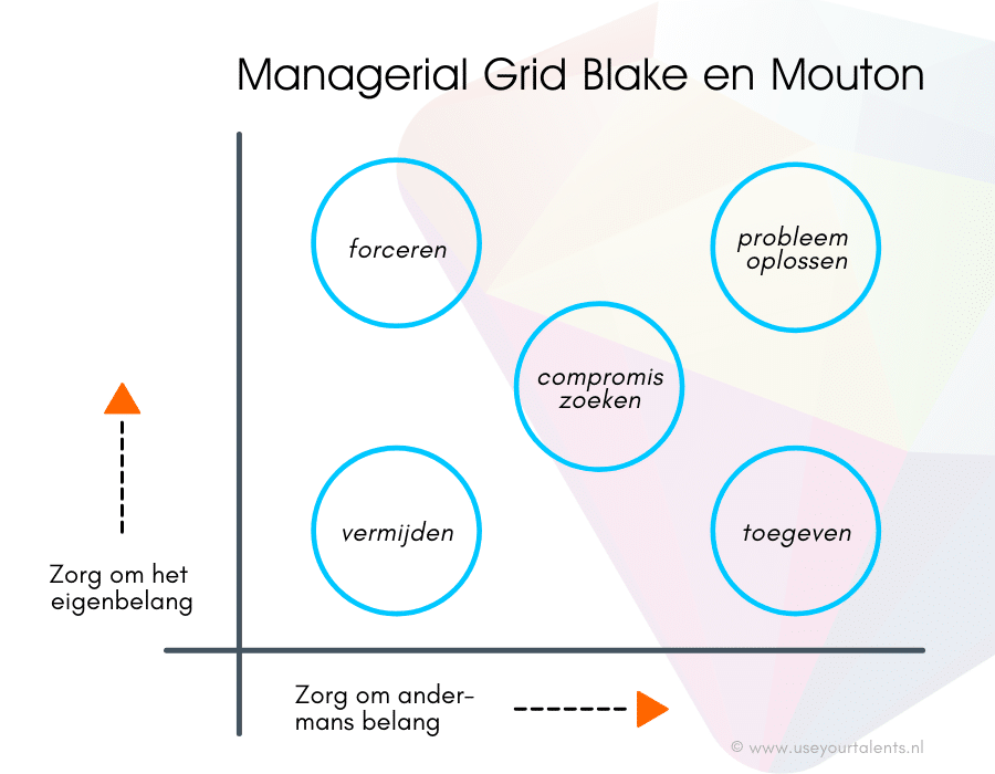 Er zijn vijf verschillende manieren waarop je met een conflict kunt omgaan. Het is dus belangrijk om je te realiseren dat ieder individu zijn eigen (onbewuste) voorkeur heeft. Alleen al daarom is het goed om bij een conflict eerst tot tien te tellen. Want niet iedere stijl is even effectief bij bepaalde situaties. Het is maar net welk element het zwaarst weegt. De relatie of de inhoud.