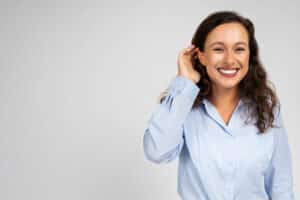 Cheerful millennial caucasian lady manager, teacher in formal wear look at camera