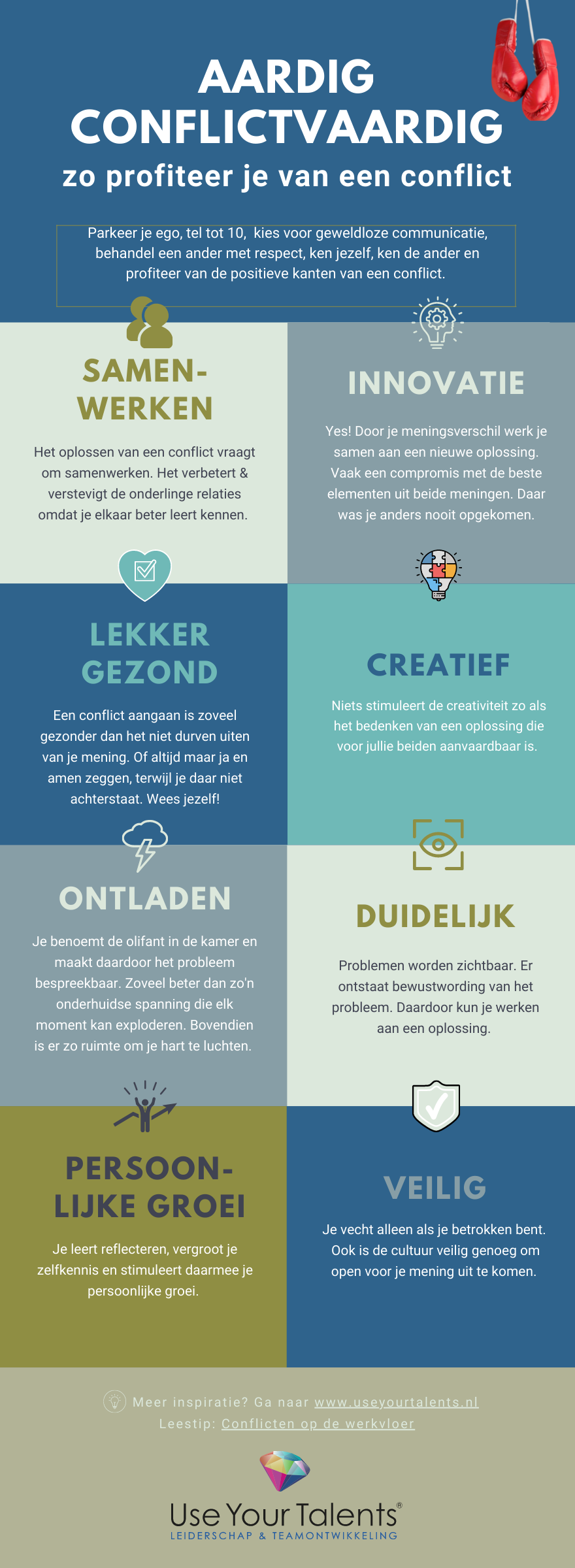 Het zit vaak diepgeworteld in het individu; de voorkeur om conflicten te vermijden. En dat is niet nodig. Conflicten hebben namelijk ook veel positieve kanten en passen prima in een cultuur van psychologische veiligheid en open en eerlijke communicatie. Download hier de infographic en wees als team aardig conflictvaardig.